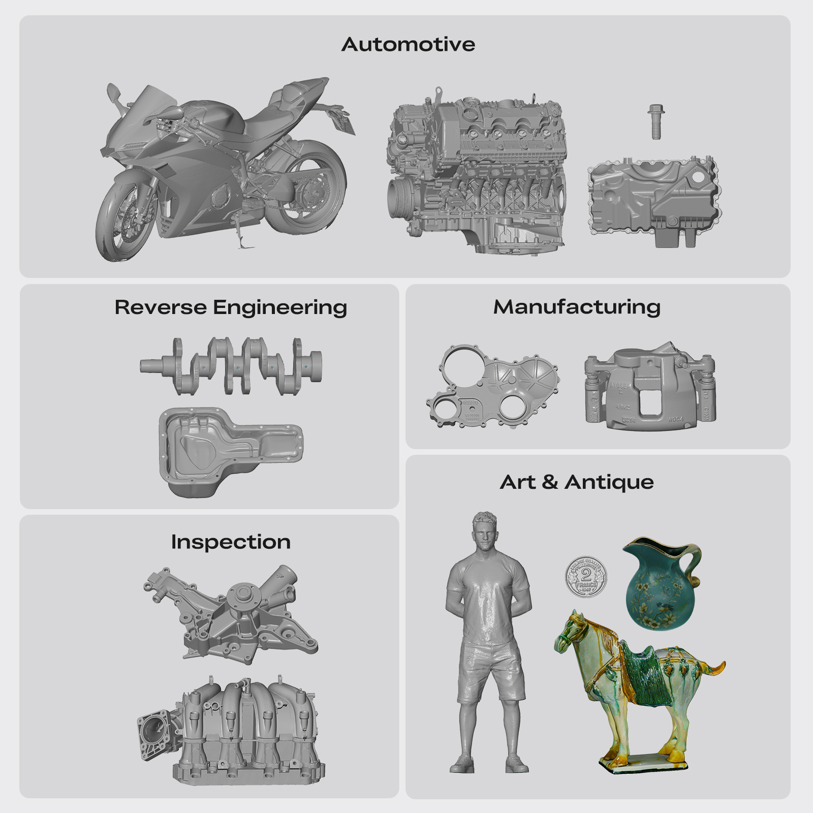 Com precisão metrológica de até 0,02 mm e volumétrica de 0,02 mm + 0,08 mm/m, o Scanner Sermoon S1 oferece resultados confiáveis em aplicações que exigem alto nível de exatidão, como engenharia reversa, inspeção e controle de qualidade. Seu sistema é capaz de escanear objetos que variam de 5 mm a 4000 mm, indo de pequenas peças técnicas a estruturas de grande porte.